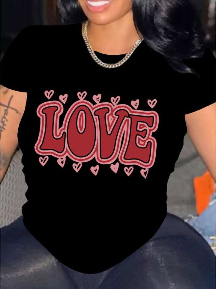 Women's Black Love Graphic T-Shirt Crew Neck Short Sleeve Casual Valentine's Day Gym Matching Jersey Fabric Plastisol Print