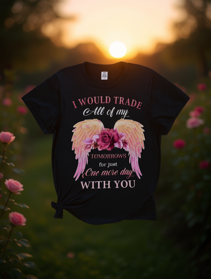 T-shirt nera da donna con grafica di ali floreali rosa e testo romantico, regalo di San Valentino, top casual in jersey a maniche corte con scollo rotondo