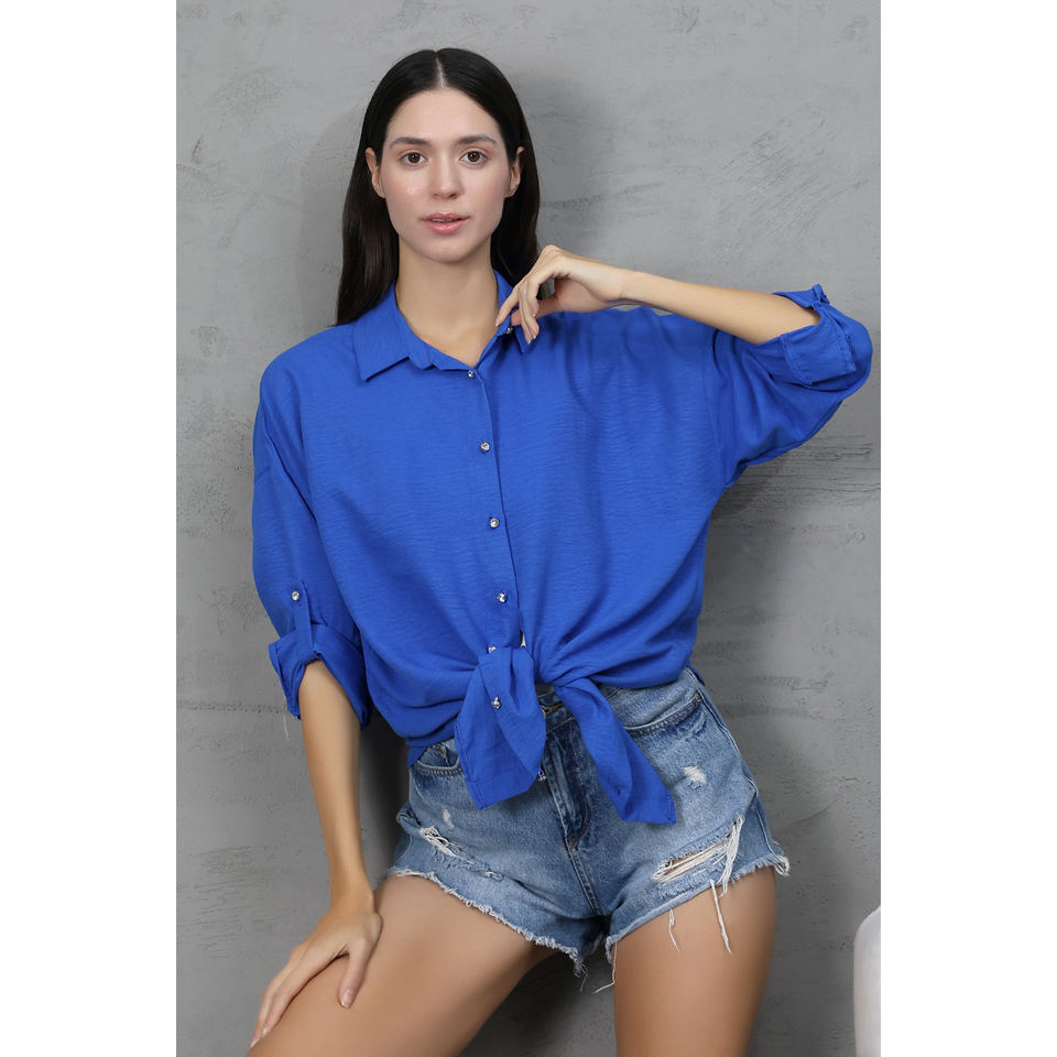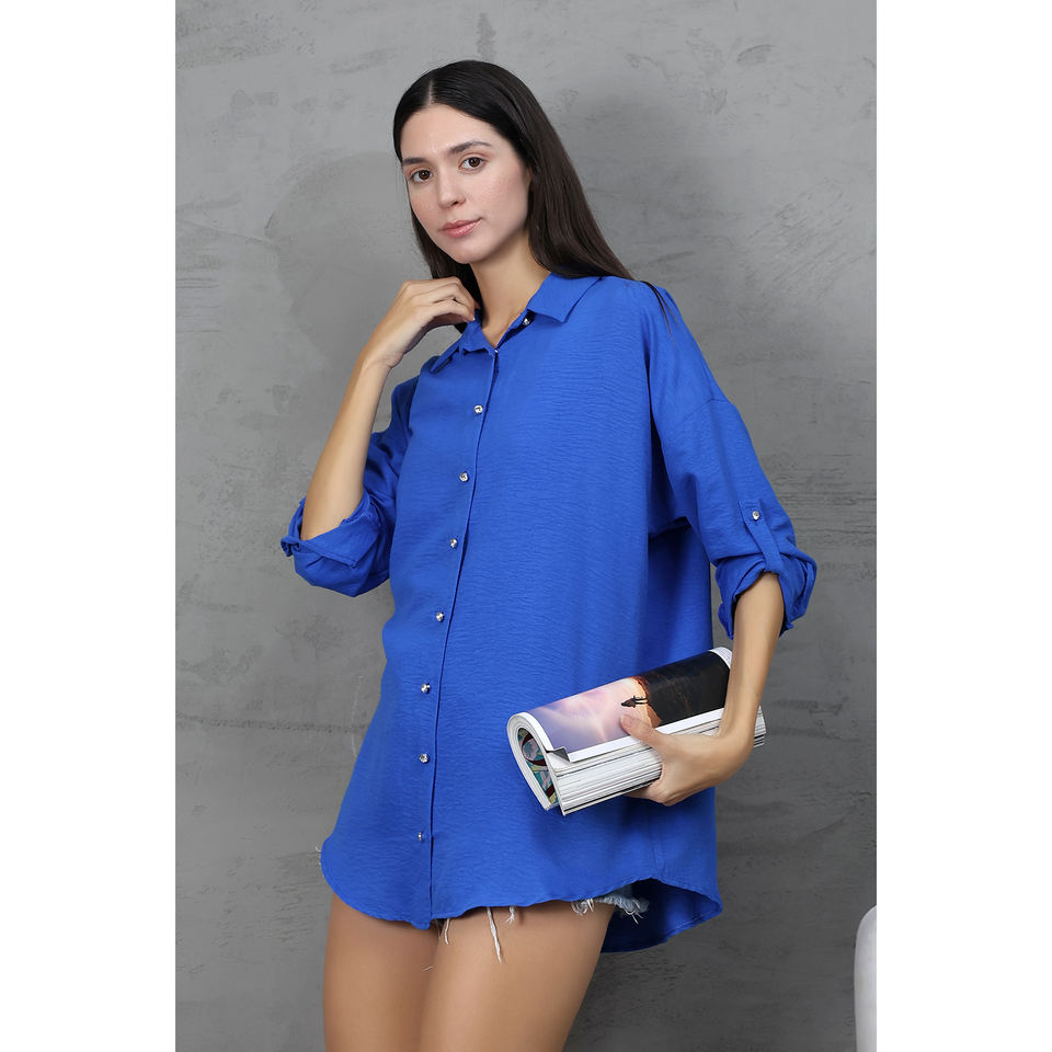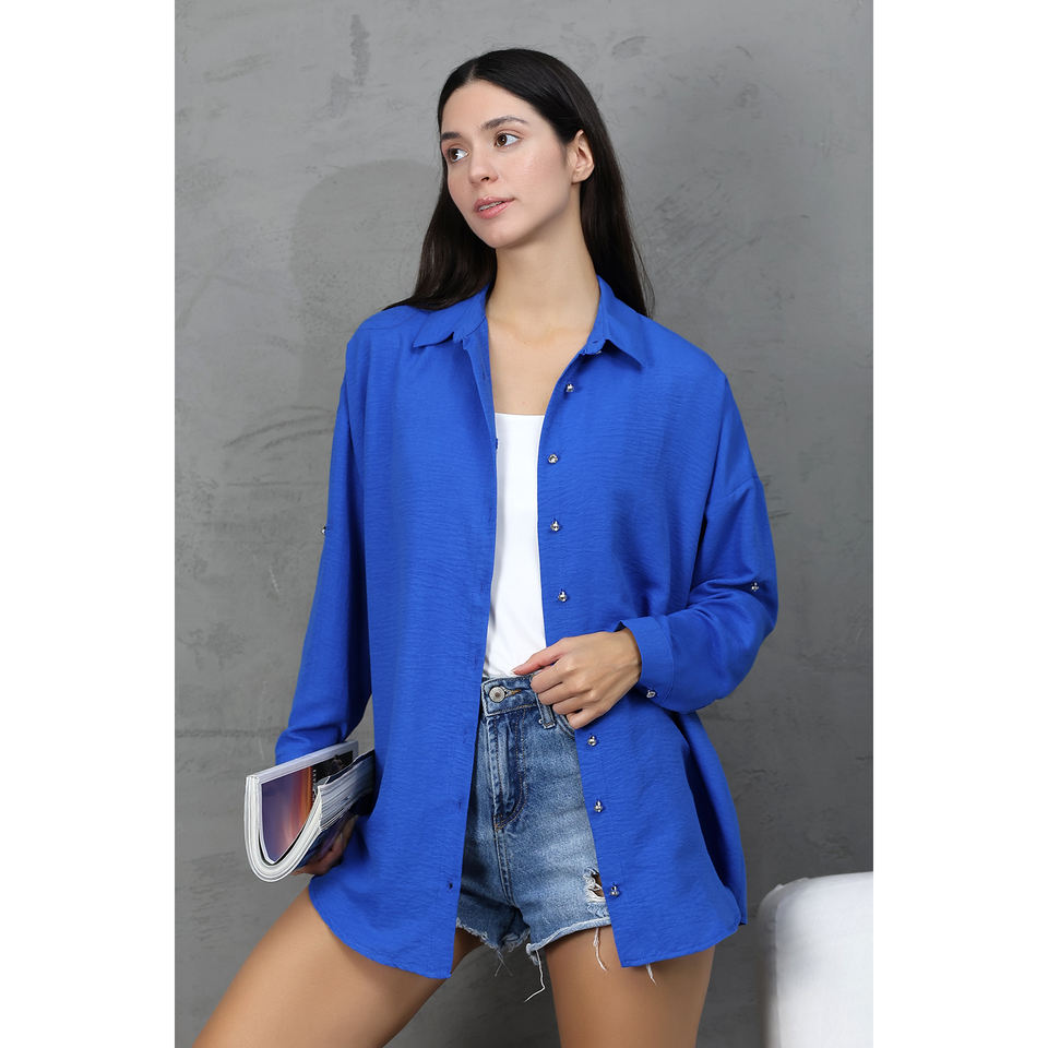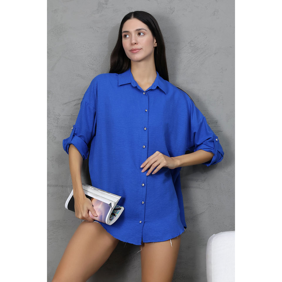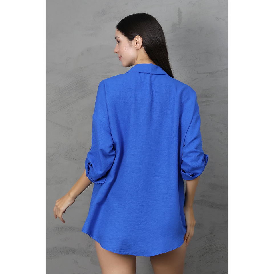Women's Blue Arobin Fabric Shirt with Low Collar Oversized Sleeves Epaulet Button Details-Available Sizes S-M-L-XL