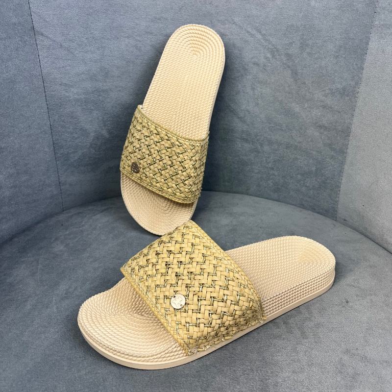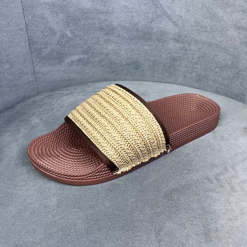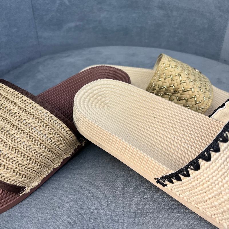 Women's Braided-Strap Plastic Upper Flat Slippers with Metal Accents Multicolored Textured Straw-Like Sole for Indoor Wear