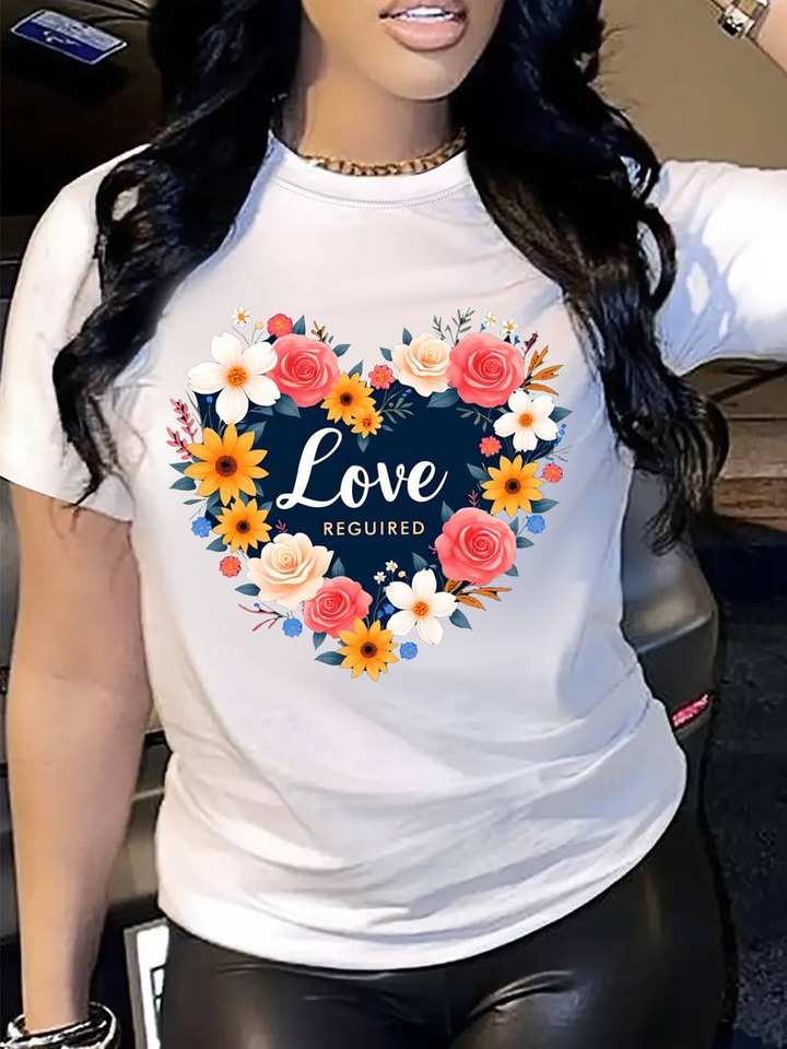 Women's Breathable Heart-Shaped Floral Print T-Shirt Short Sleeve Round Neck Casual Spring Summer 100% Cotton Jersey Fit