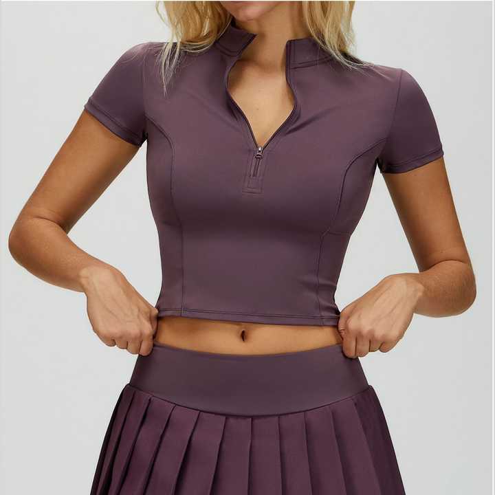 T-shirt Sportiva da Donna a Maniche Corte con Collo Alto e Mezza Zip, Traspirante ed Elasticizzata, Top Corto per Allenamento e Palestra