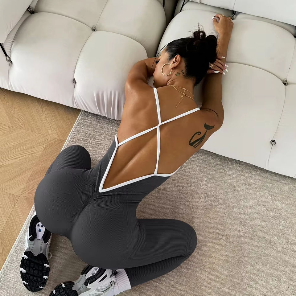 Tuta da Yoga da Donna Traspirante con Bretelle a Contrasto, Body Sportivo Senza Maniche ad Asciugatura Rapida, Completo Fitness Aderente in Tessuto a Costine, Nessun MOQ