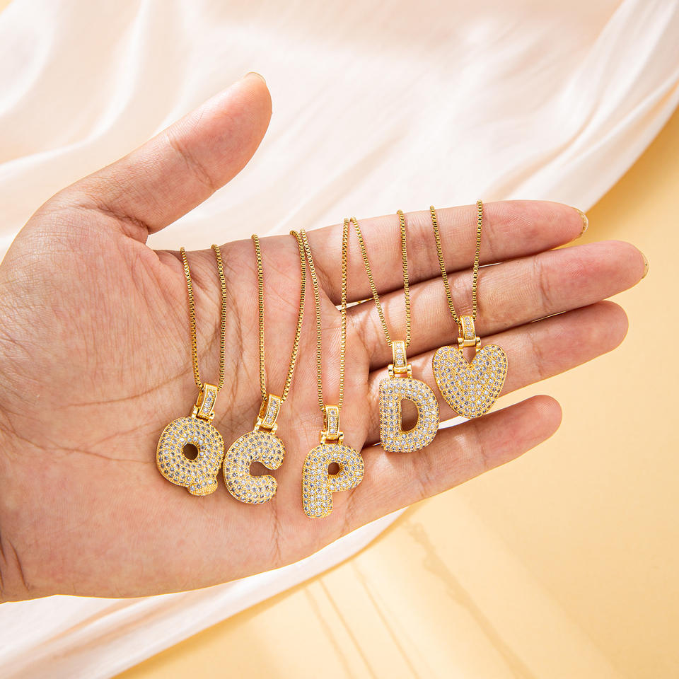 Women's Bubble Letter Necklace Gold Plated Stainless Steel Zircon Chunky Initial Name Balloon Alphabet Pendant Necklace