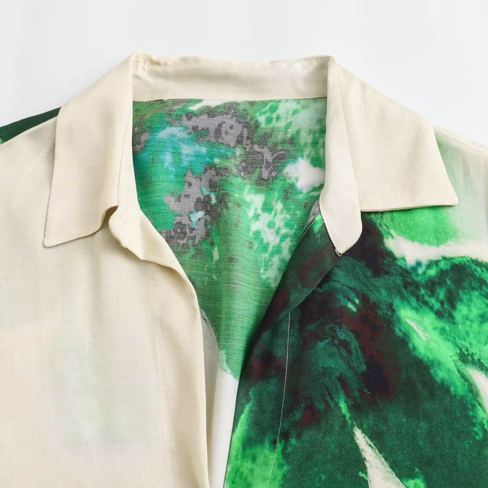 Women's Casual Fashion Blouses Tops Beige Green Button-Up with Turn Collar Long Sleeves Woven Vintage Print Pattern Breathable