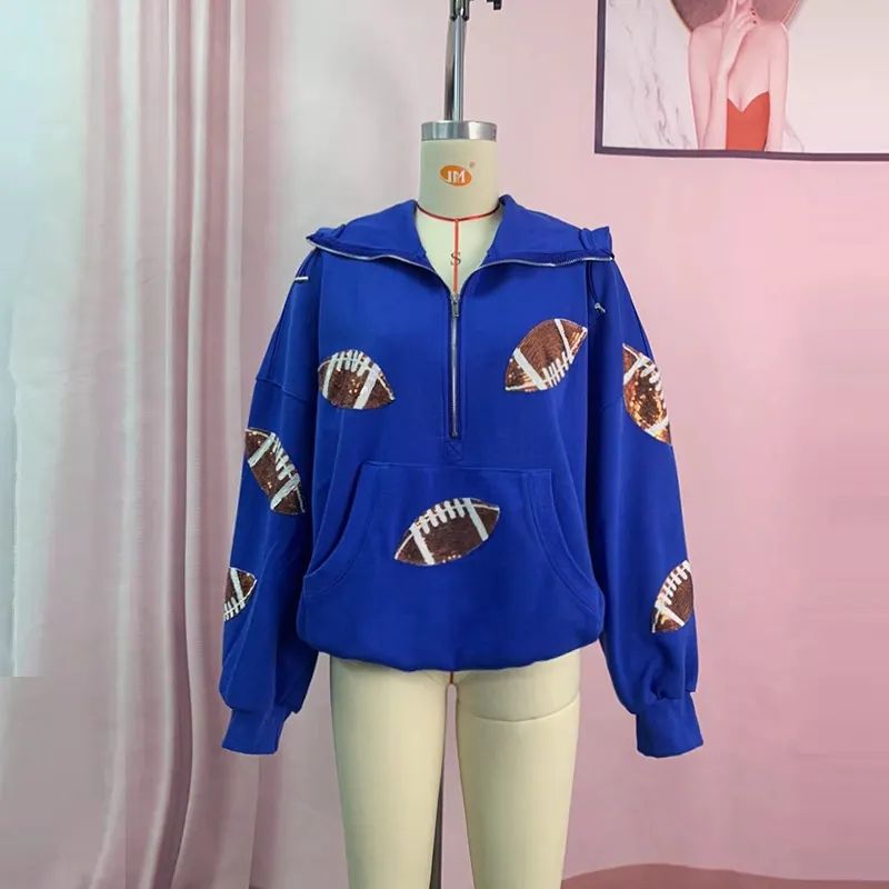 Women's Casual Long-Sleeve Zipper Sweatshirts 7-Color Football Sequin Rugby Patches with Pocket Hooded Winter Pullover