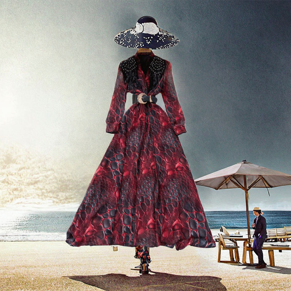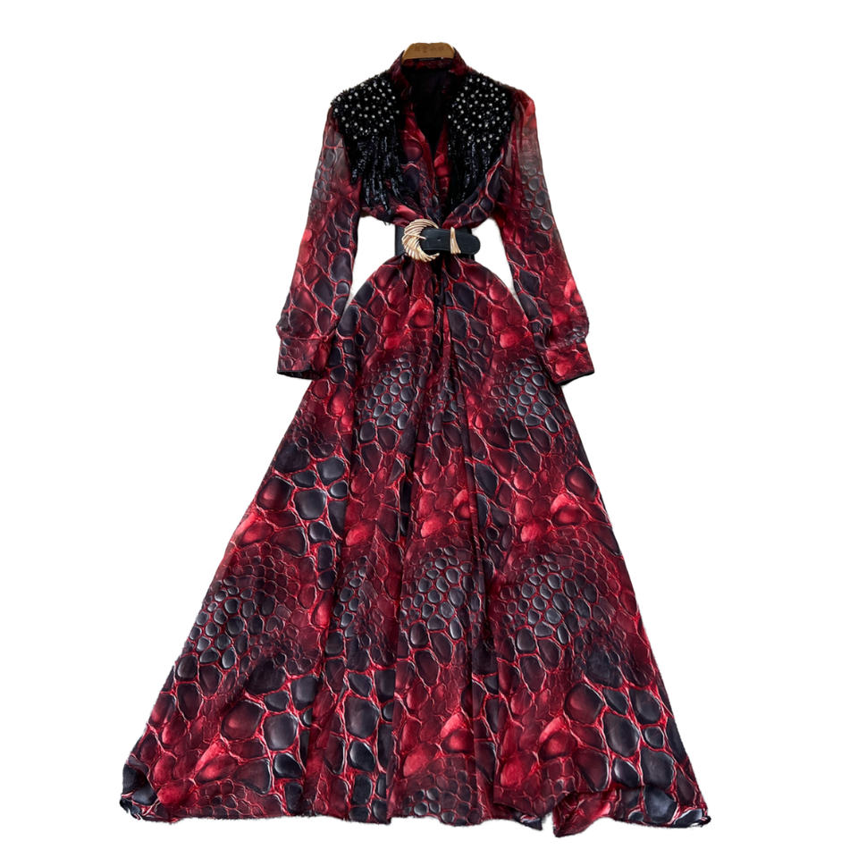 Women's Casual Midi Dress Spring Roman V-Neck Tunic Leopard Print Beaded Embroidery Sequined Lace Breathable Empire Woven Front