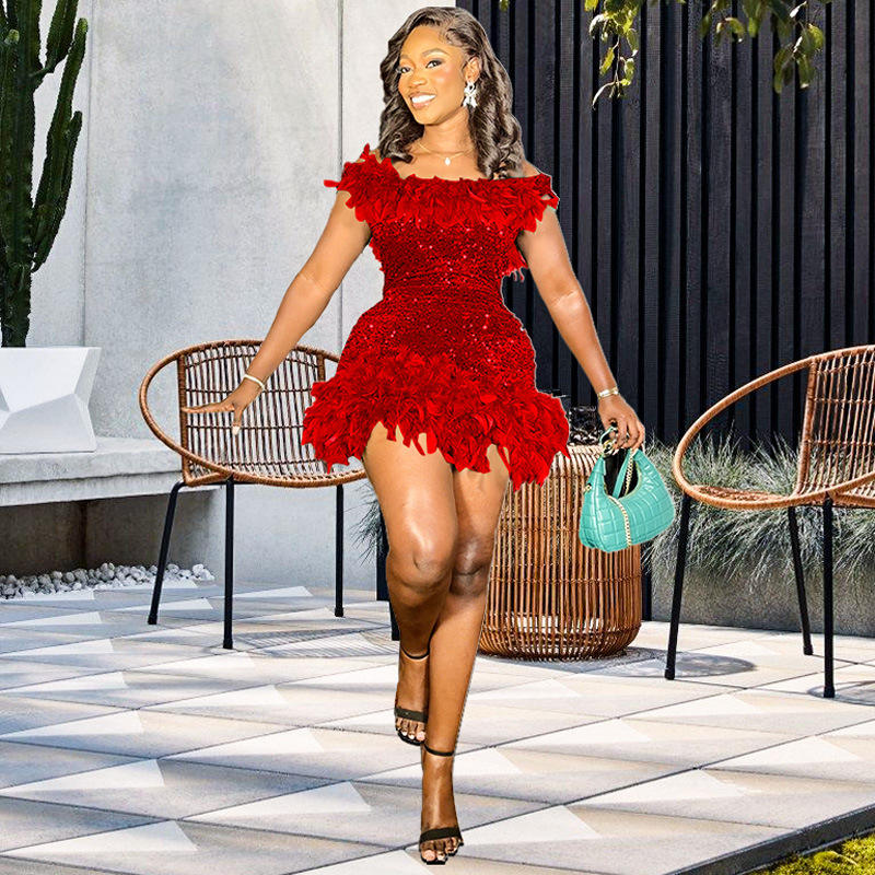 Abito Casual da Donna Taglie Forti, Aderente, Spalle Scoperte, Decorazione in Pizzo con Piume, Logo Frontale, Vendita all'Ingrosso per Negozi Indipendenti