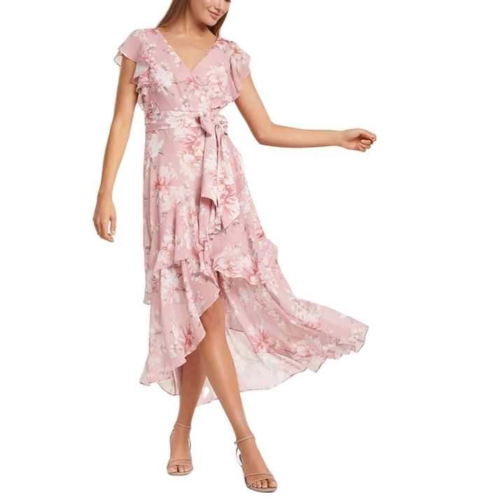 Women's Casual Summer Chiffon Dress with Floral Print Tie Waist Asymmetrical Front Hem Ruffled Sleeves Midi Length