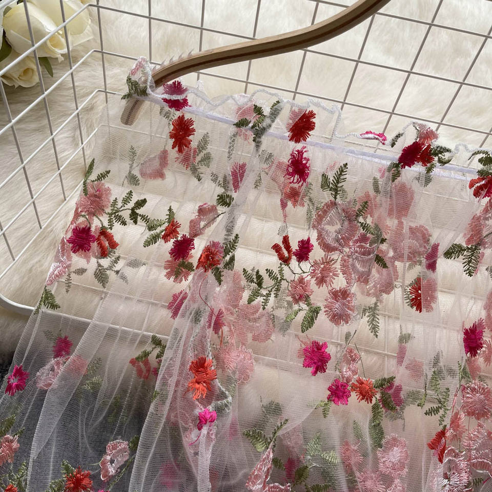 Women's Casual Summer One-Shoulder Floral Embroidered Mesh Blouse Short Puff Sleeve Long Lace Front Loose Long-Sleeved Shirt