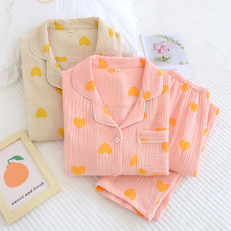 Women's Comfortable Cotton Crepe Pajamas Elastic Waist Breathable Crepe Lapel Sleepwear Shirt for Home Summer Style