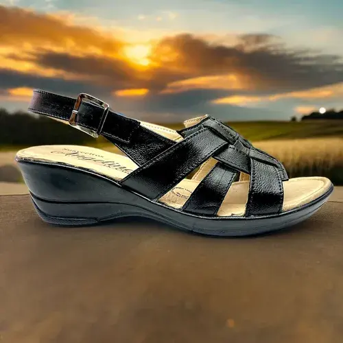 Angelina Women's Leather Wedge Sandals Mid Heel Open Toe Ankle Strap Comfortable Fashionable Slides Size 6.5