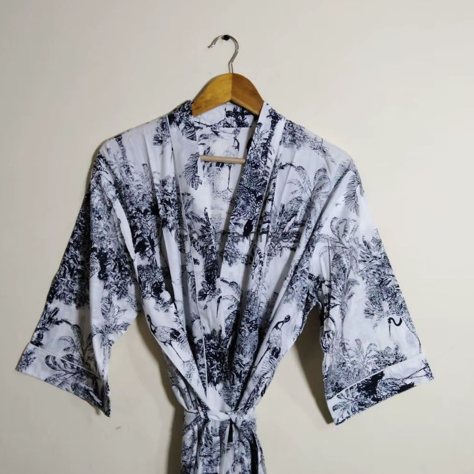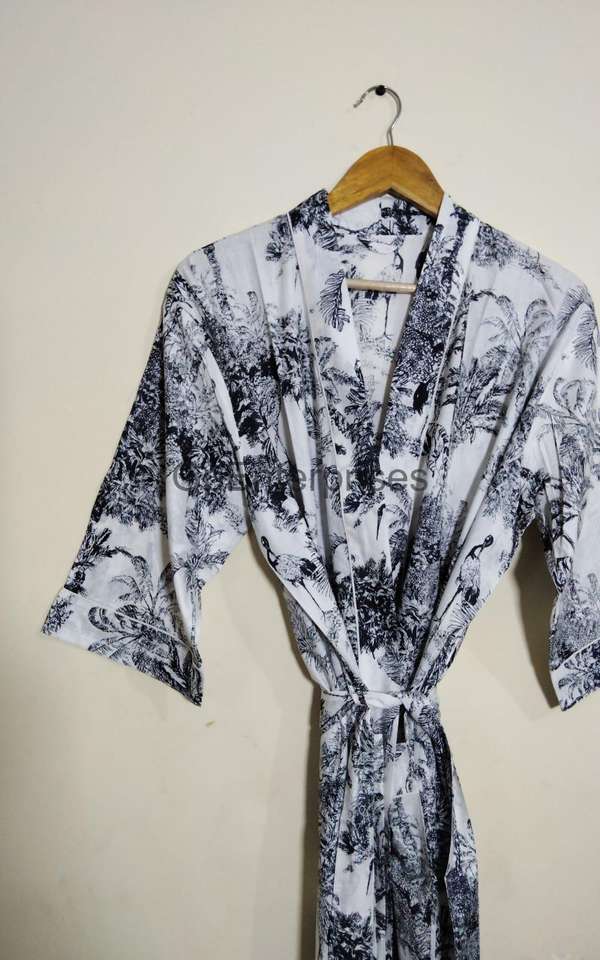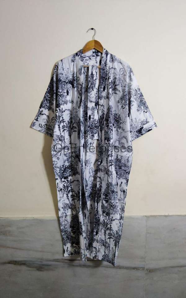 Women's Cotton Black Animal Print Kimono Robe Green Dressing Gown for Summer Weddings Beach Holidays and Nights Breathable