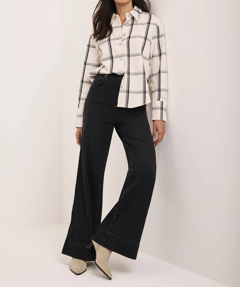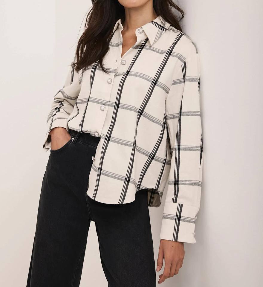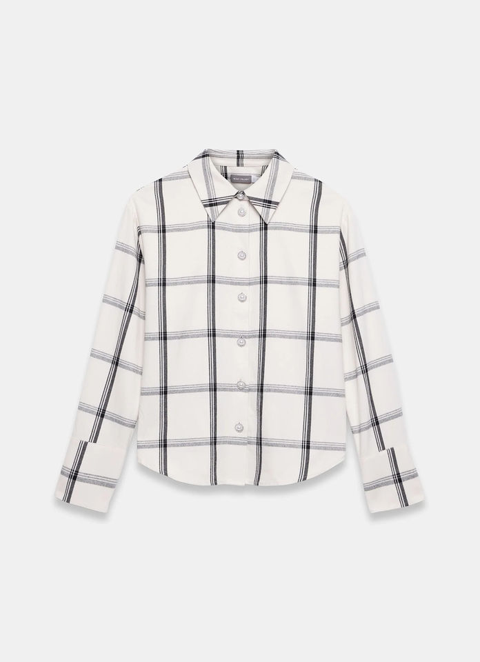 Women's Cream Cotton Plaid Shirt -long Sleeve Button Down Checked Blouse for Office or Casual Wear