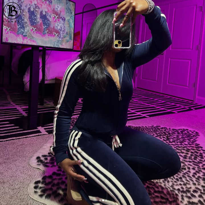 Tuta da donna con righe laterali personalizzate in velluto nuova costola con cerniera giacca in velluto pantaloni da Jogger due pezzi Set abbigliamento