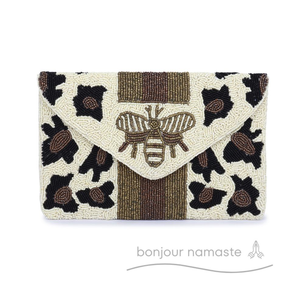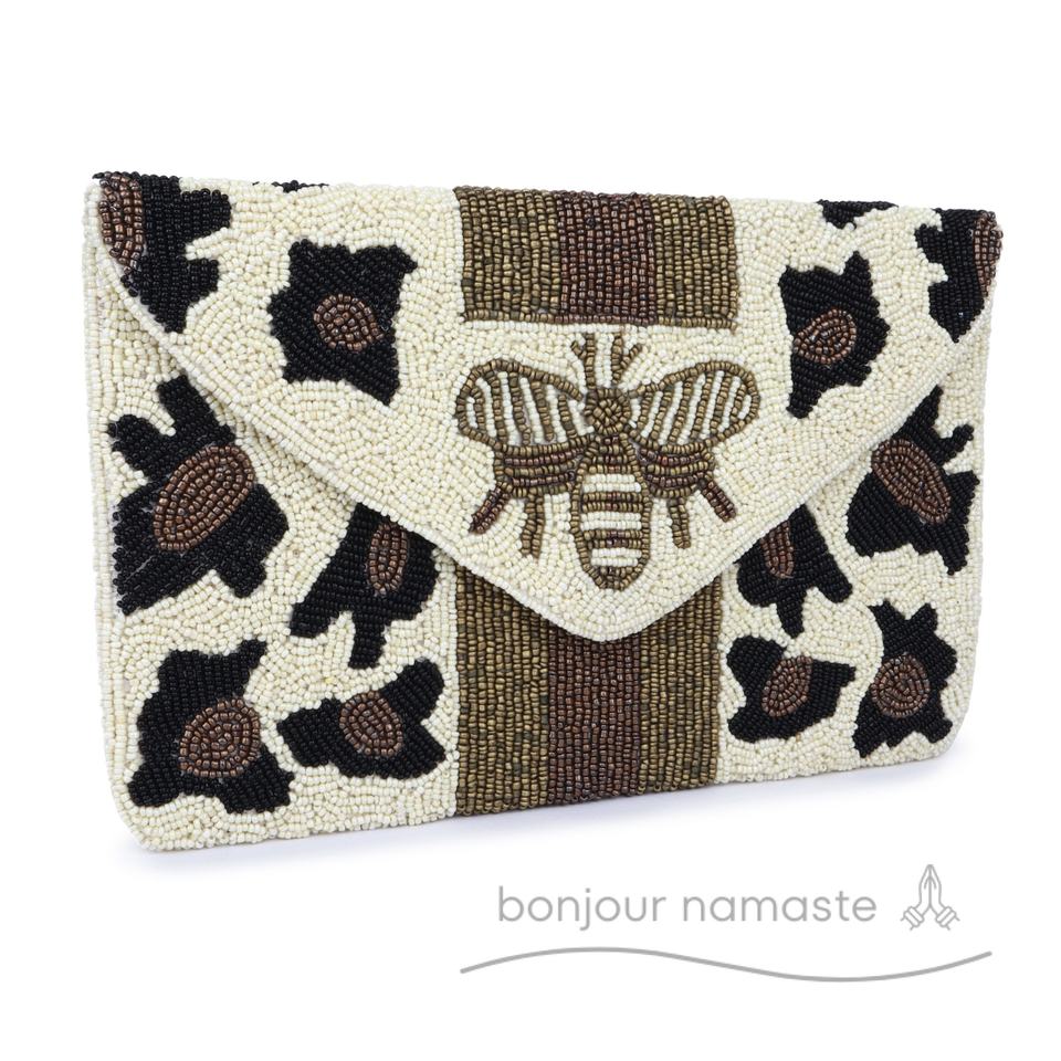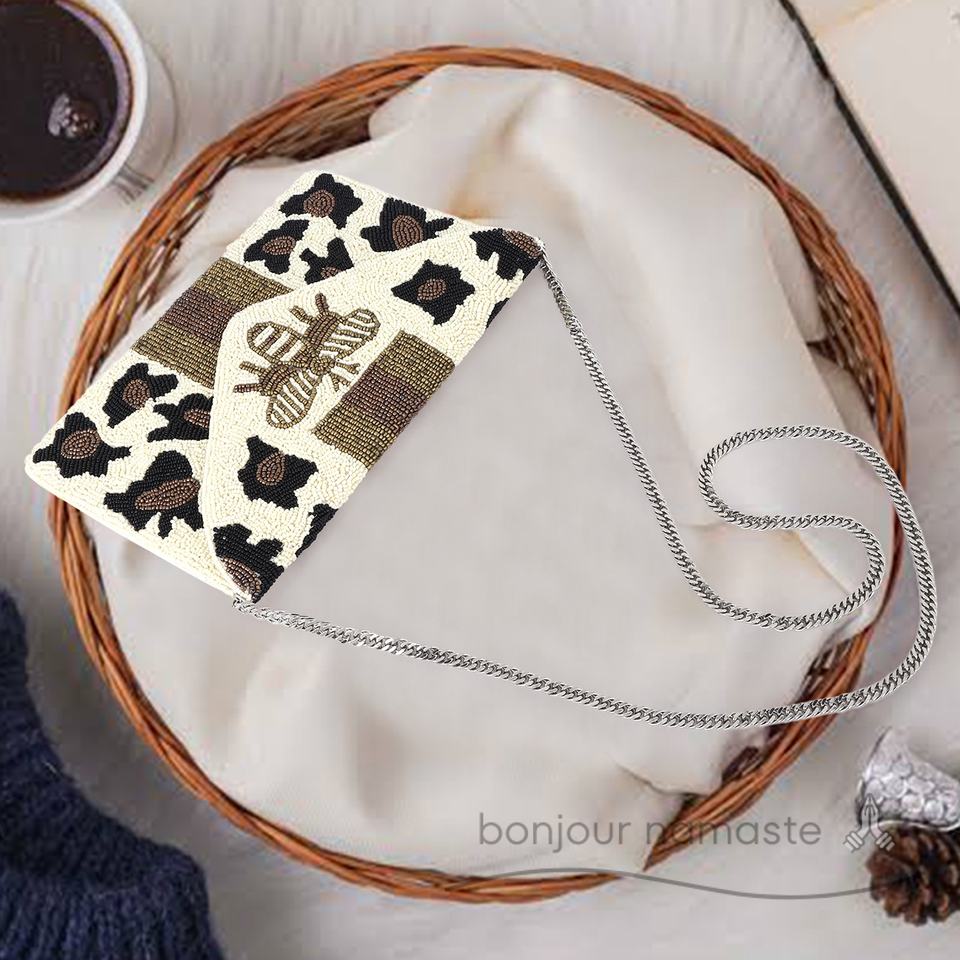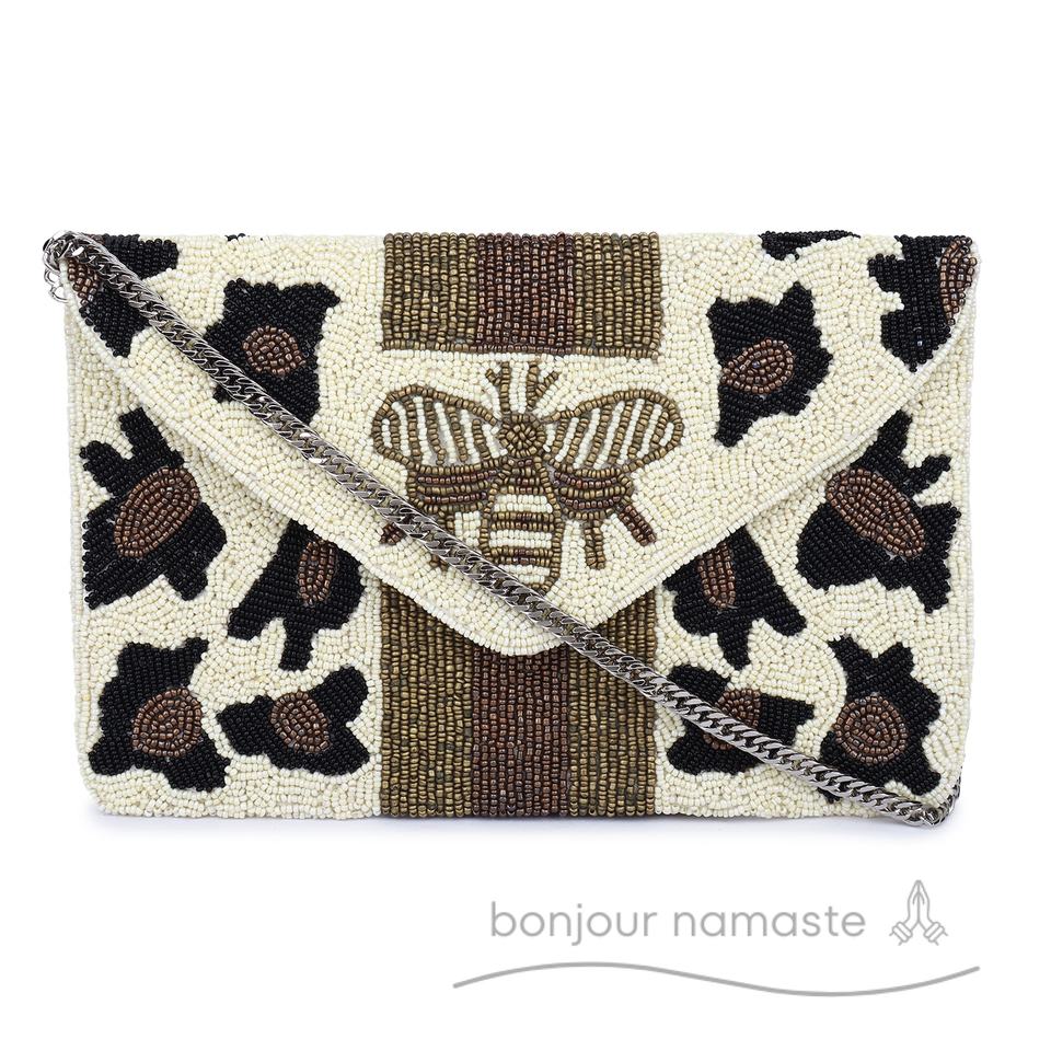 Women's Designer Saddle Purse 100% Handcrafted with Glass Beads | Bee Embroidery Design | Artisan Handmade Purse Eco-friendly