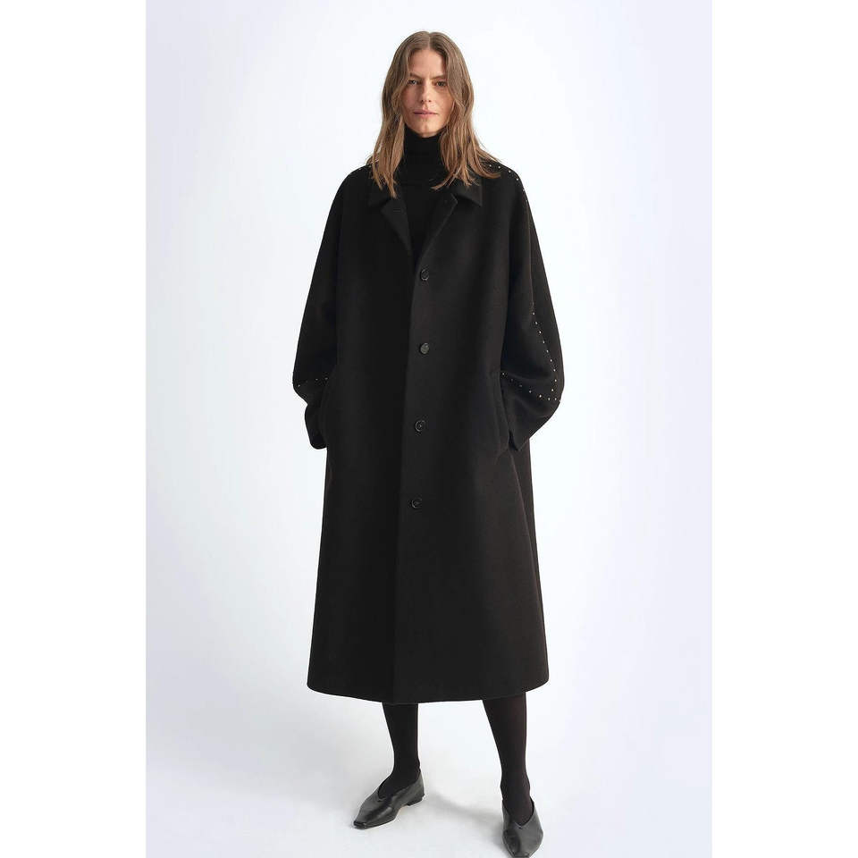 Women's Dream of Champs Elysees Wool Coat Long Autumn and Winter Coat with Riveted Lapel Breathable Denim Fabric Woven Coat