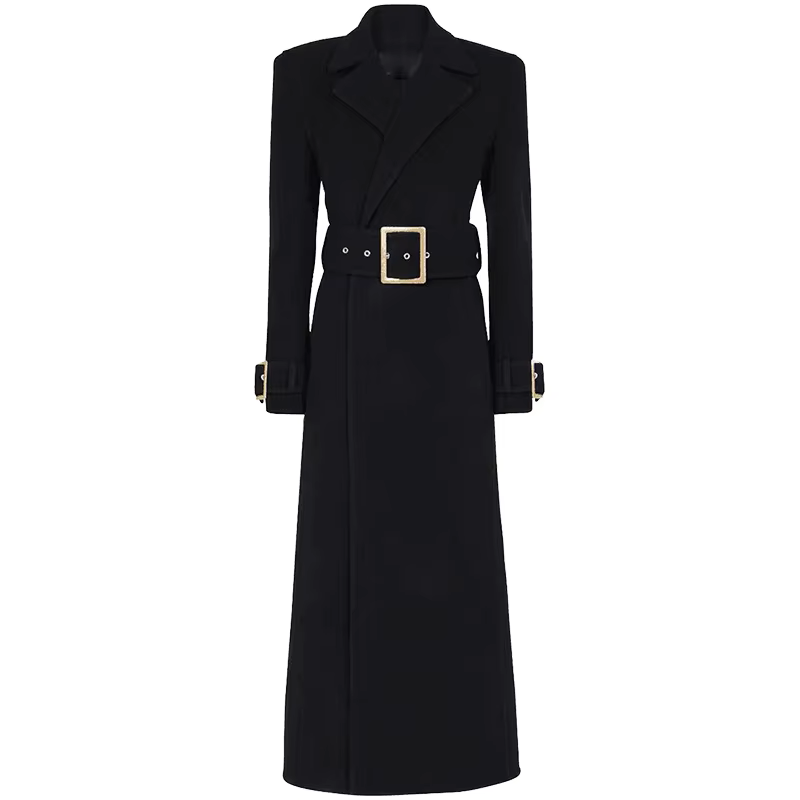 Women's Elegant Long Black Trench Coat Gold Buckle Single Breasted Windproof Woolen Streetwear Style for Spring Season Size XS