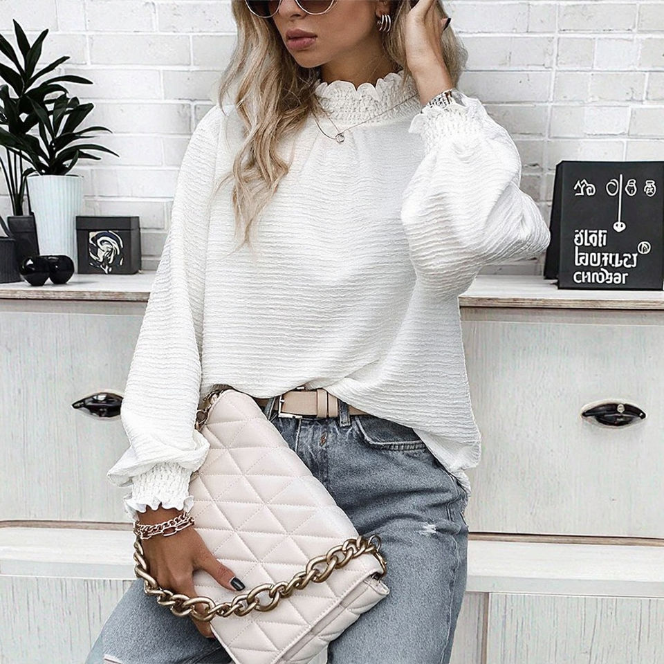 Maglietta da donna elegante tinta unita con collo alto con maniche a lanterna Versatile maglietta bianca