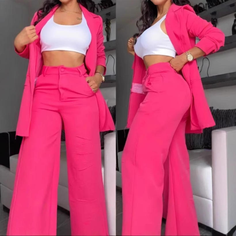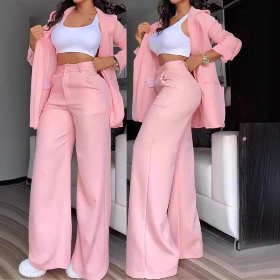 Women's Elegant Summer Straight Pants Suit with Button Decoration Pure Color Split Sleeve Lapel Suit with Pocket
