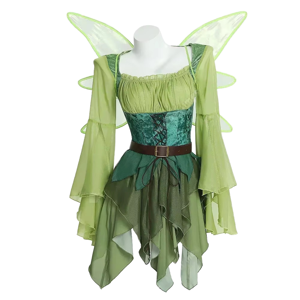 Women's Elf Medieval Green Fairy Dress Magical Elf Dress and Belt Halloween Cosplay Costumes with Wings