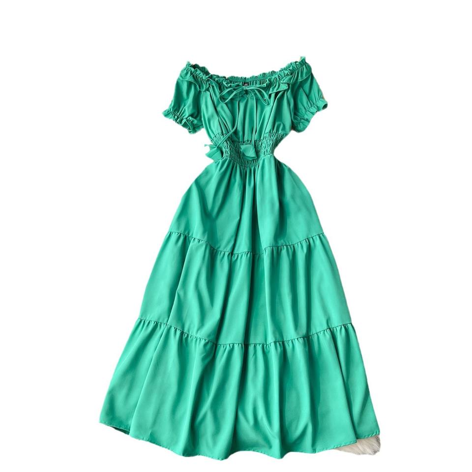 Abito da donna stile francese con spalle scoperte, maniche a sbuffo, vita impero e effetto snellente, stile fatato per vacanze dolci