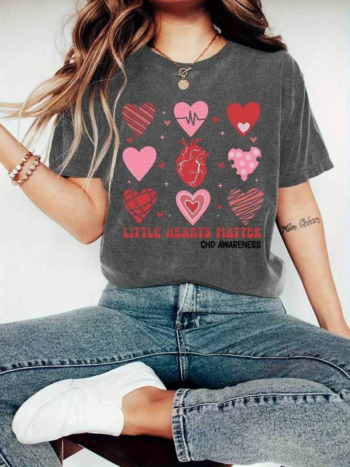 Women's Heart Disease Awareness T-Shirt Short Sleeve Round Neck Cartoon Heart Design Spring Summer Casual Wear Machine Washable