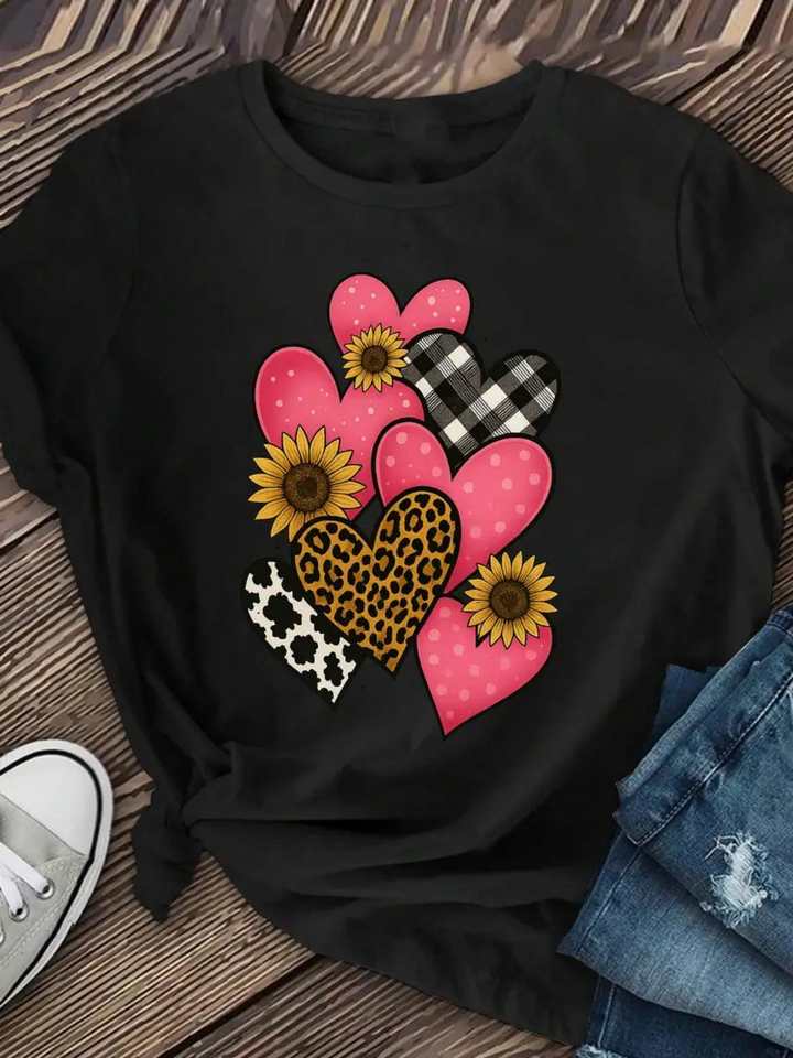 Women's Heart Print T-Shirt Short Sleeve Round Neck Casual Cotton Jersey Shirt With Plaid Polka Dot Animal Print For Spring