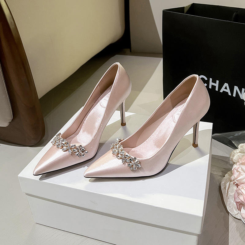 Women's High Quality Satin Wedding Shoes Female Heels with Low Thin Heel and Pointed Design New Season Bridal Shoes for Summer