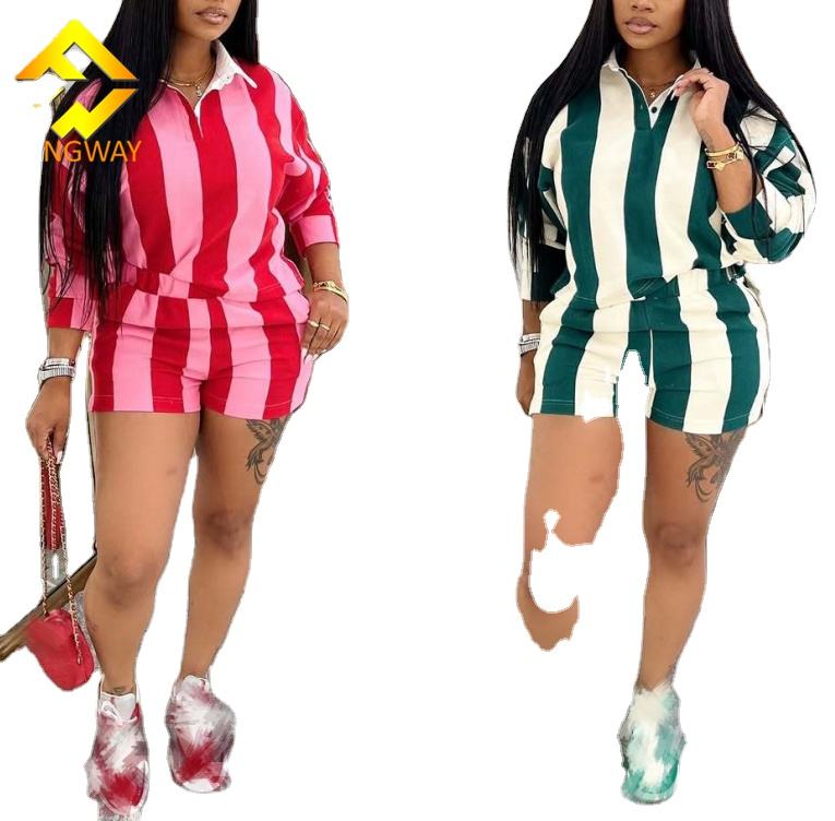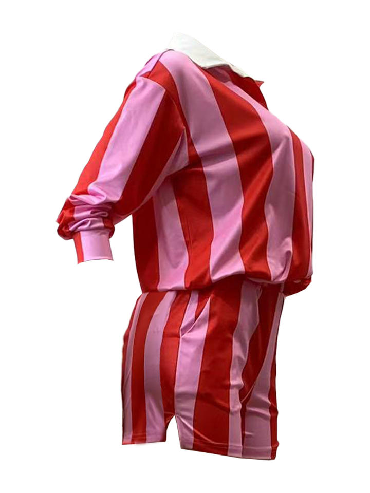 Completo da donna due pezzi di alta qualità: camicia a maniche lunghe a righe e pantaloncini con vita elasticizzata e decorazioni in pizzo, stile casual e alla moda.
