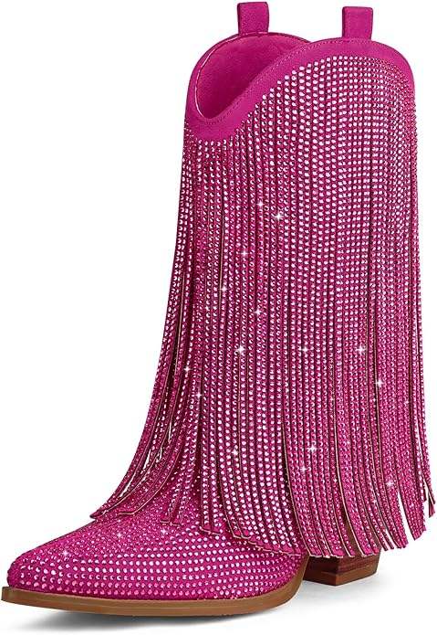 Women's High Top Cowboy Boots Cowgirl Western Rhinestone Tassel ZIP Closure Microfiber Leather Upper 7.5cm Chunky Heel Pointed
