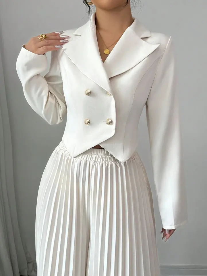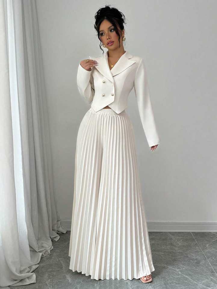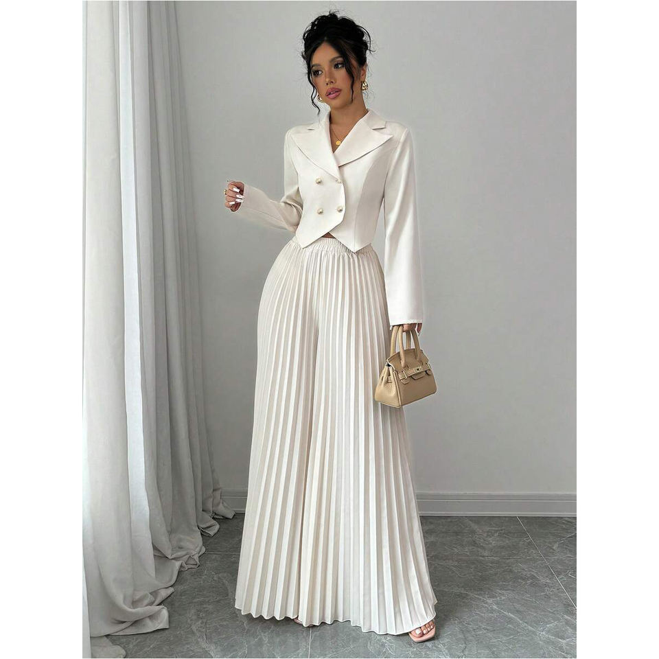 Women's High Waisted Blazer Jacket Tops Pleated Wide Leg Trousers Office Commuting Two Piece Set Loose Fit Solid for Autumn