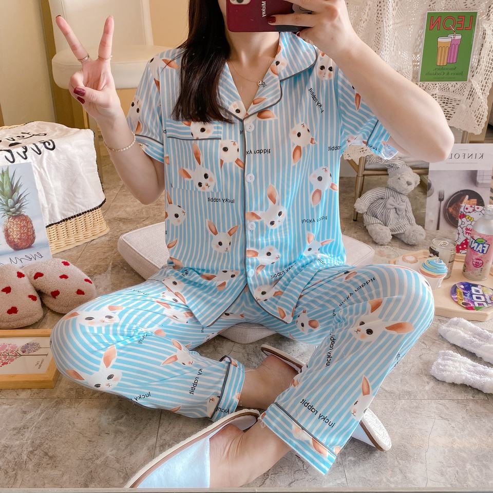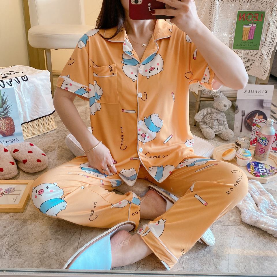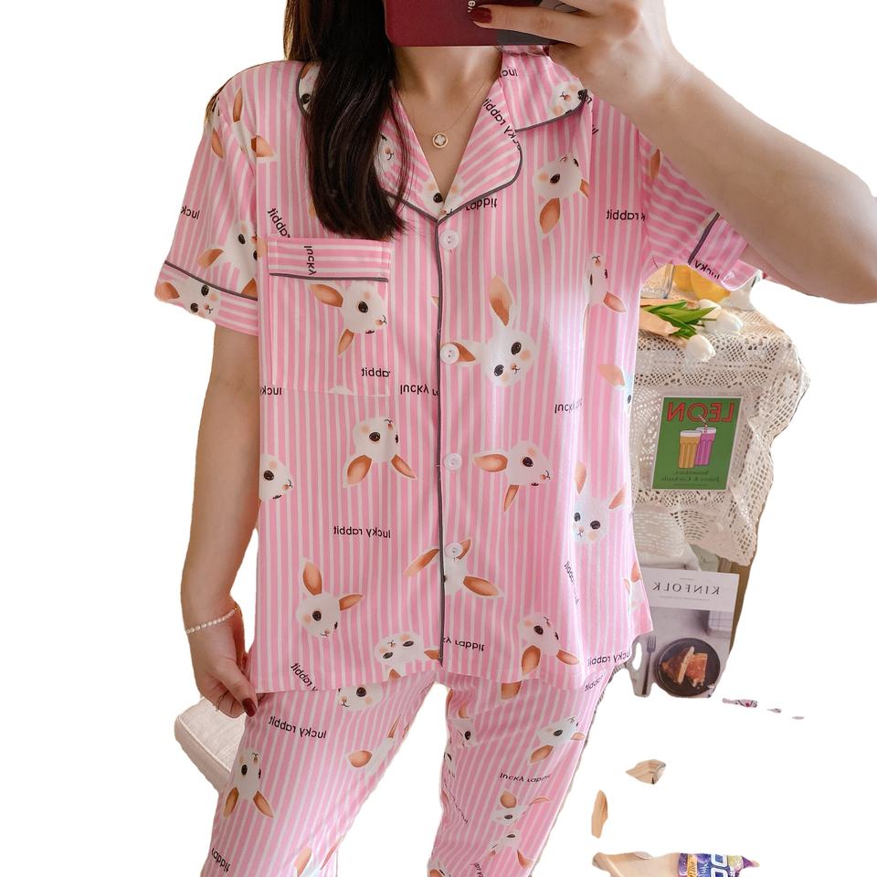 Pigiama da donna con risvolto e bottoni con Cardigan 2 pezzi Set di cartoni animati in seta latte stampati Casual a maniche corte in tessuto per la casa