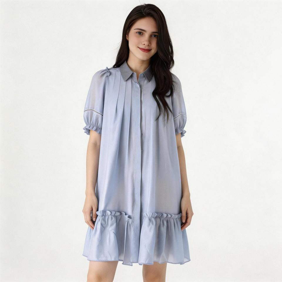 Abito Estivo Casual da Donna in Chiffon Azzurro con Colletto, Maniche a Sbuffo, Pieghe e Orlo con Volant