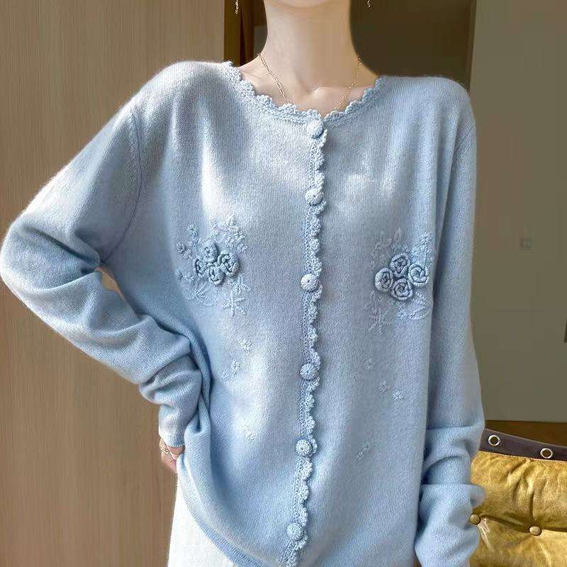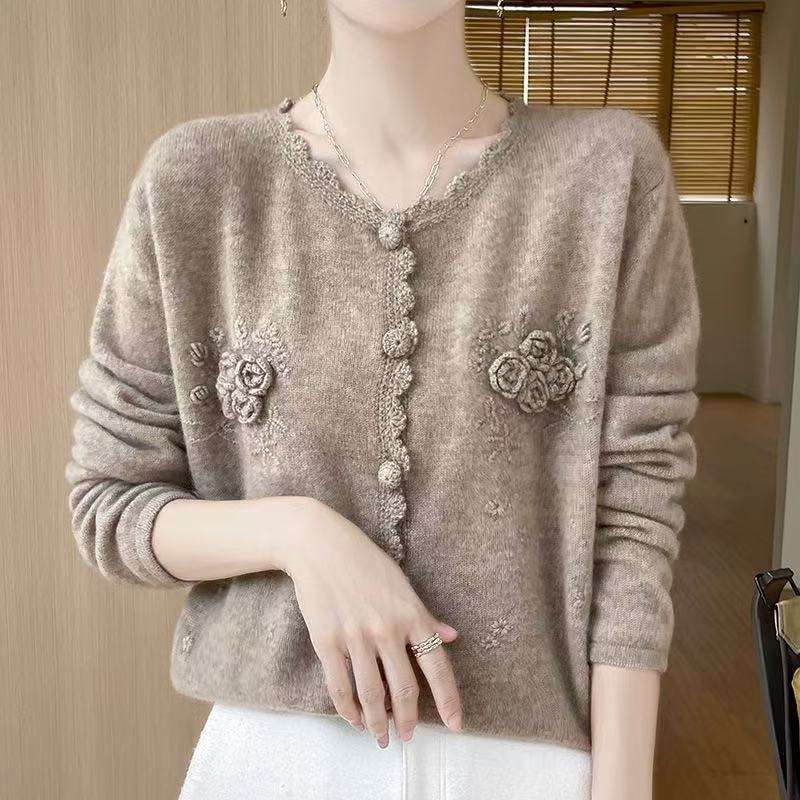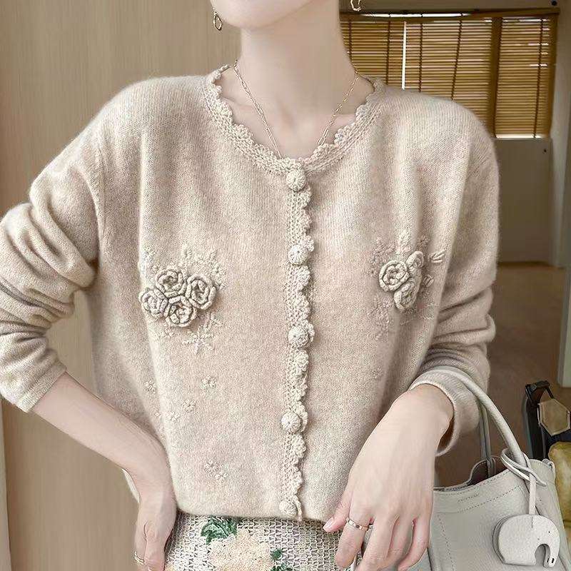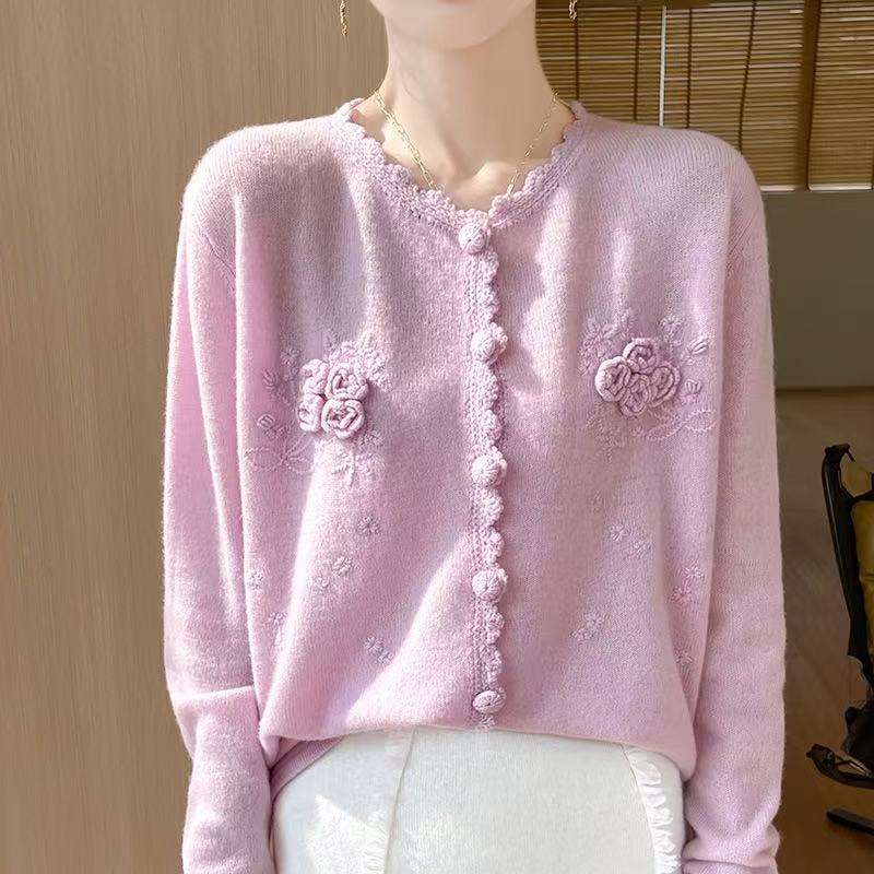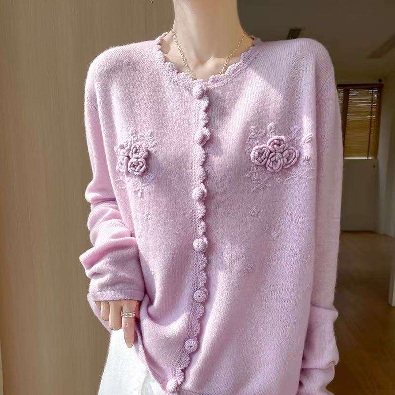 Cardigan Lavorato a Maglia Lilla da Donna con Fiori 3D e Bordo Sfilacciato, Maglione con Bottoni