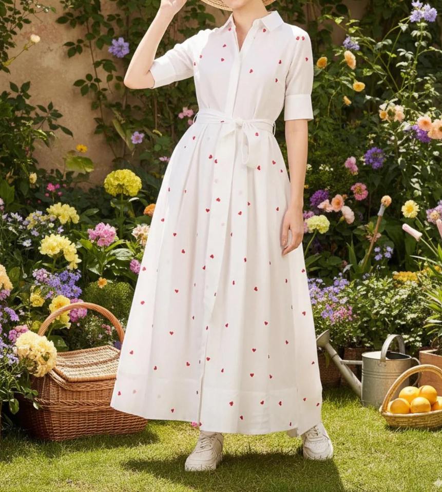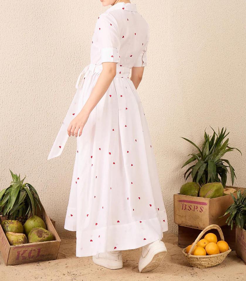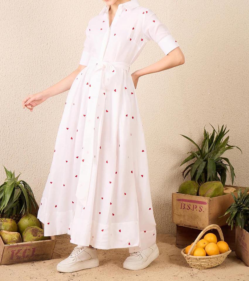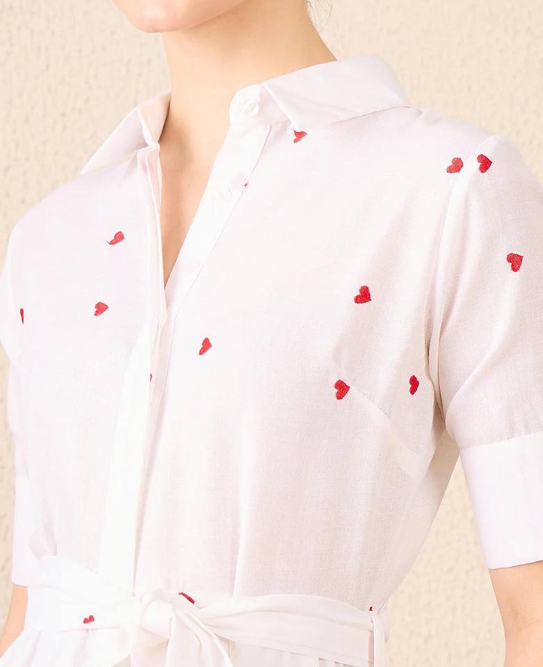 Women's Linen White Button Shirt Maxi Dress with Red Heart Embroidery Short Sleeve with Belt for Daily Wear