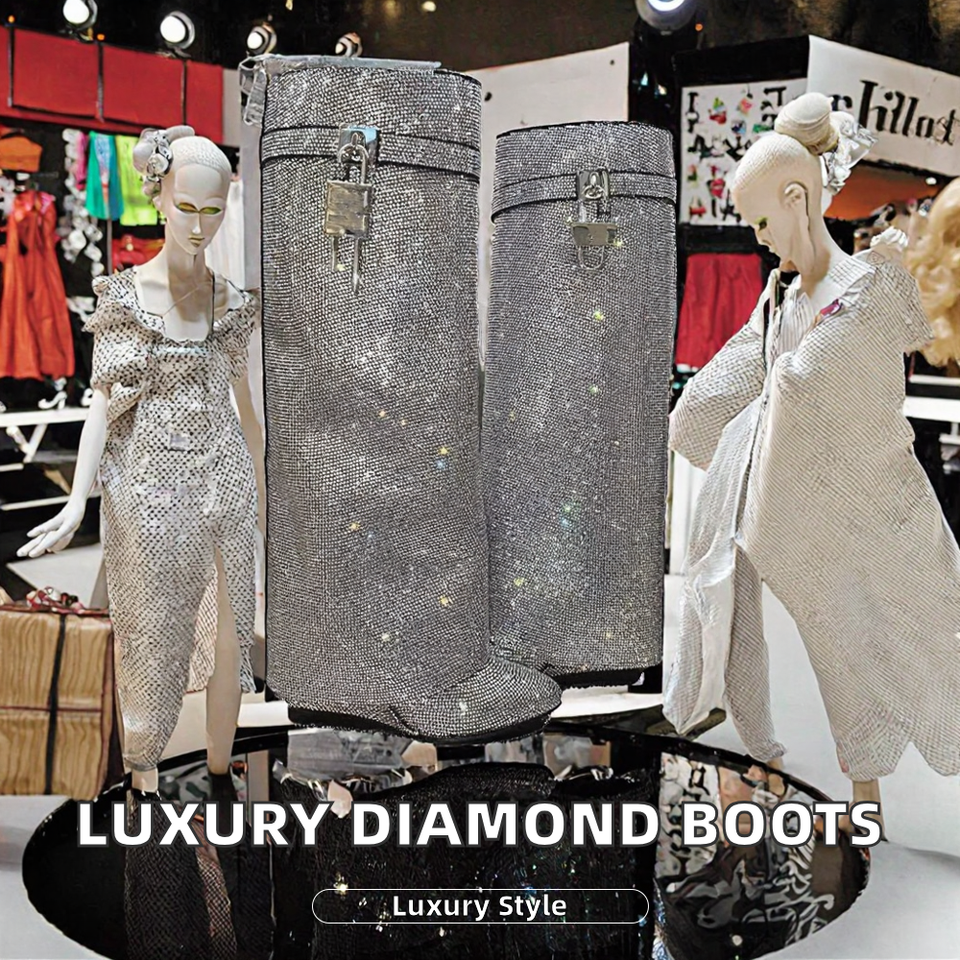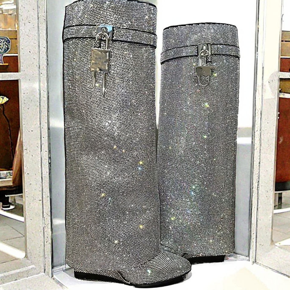 Women's Luxury Knee-High Boots with Full Diamonds Soft Shiny Overlay Slip-On Wedge Heel Metal Lock-for All Seasons