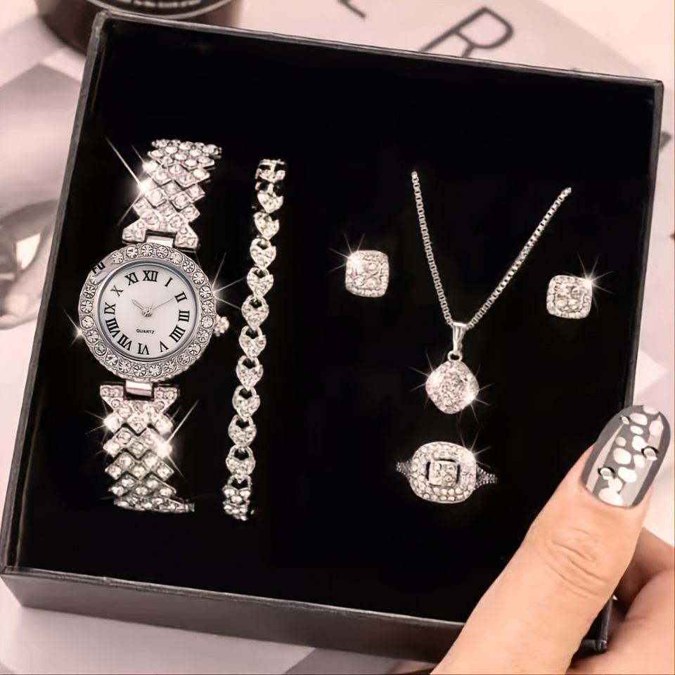 Women's Luxury Women's Watch Five Piece Bracelet Set, Fashionable Quartz Watch, Elegant Rhinestone Glass Accessory