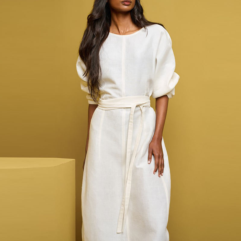 Abito Casual da Donna in Lino a Mezza Lunghezza, Nuovo Colore Tinta Unita Tessuto per l'Autunno, Servizio Personalizzato, Traspirante e Antistatico