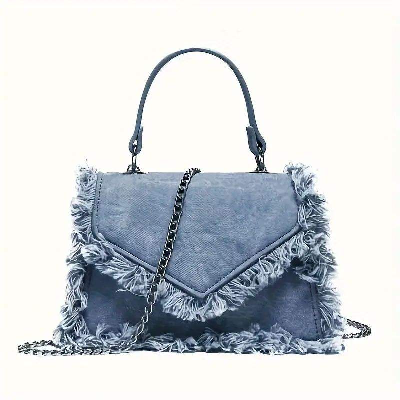 Borsa a Tracolla in Denim con Manico Superiore e Bordi Grezzi per Donna