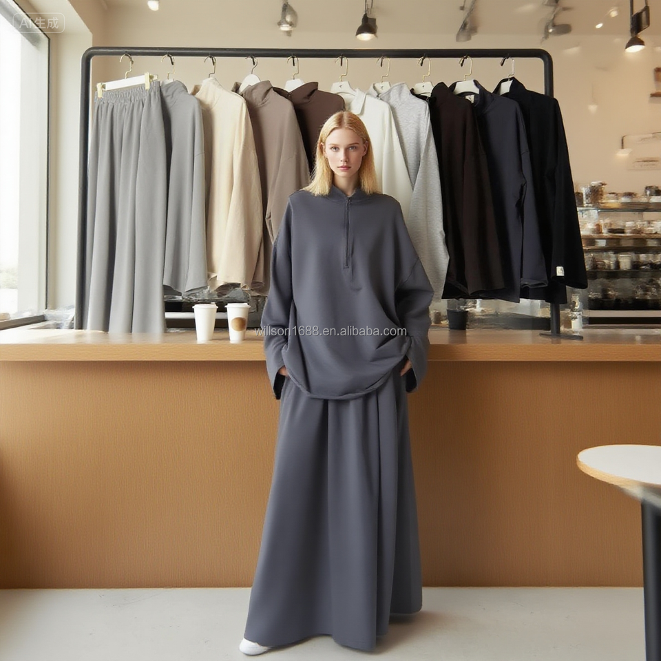 Set Modesto da Donna in 2 Pezzi, Top e Gonna in Cotone Traspirante, Motivo Tinta Unita, Abbigliamento Casual Autunnale e Invernale, Vendita all'Ingrosso di Abbigliamento Islamico per Adulti