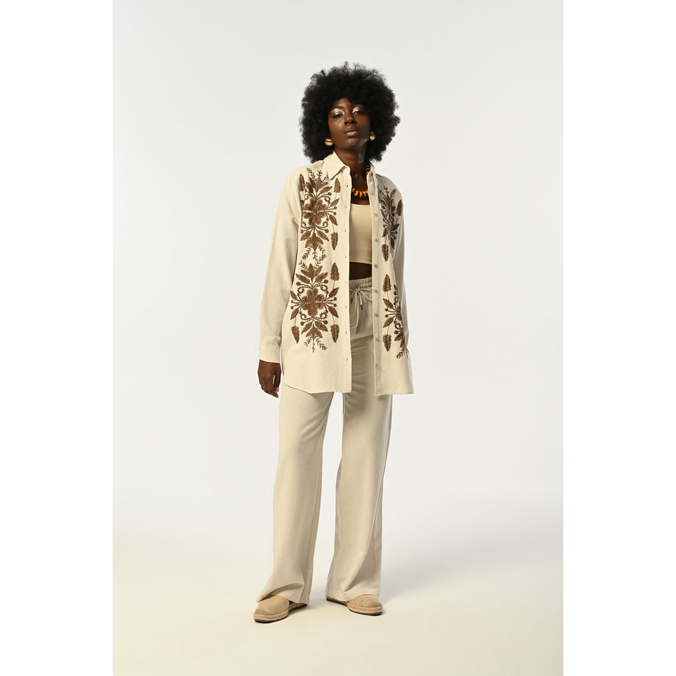 Women's Natural Color Oversize Shirt with Brown Embroidery on Front Elegant Blouse & Top