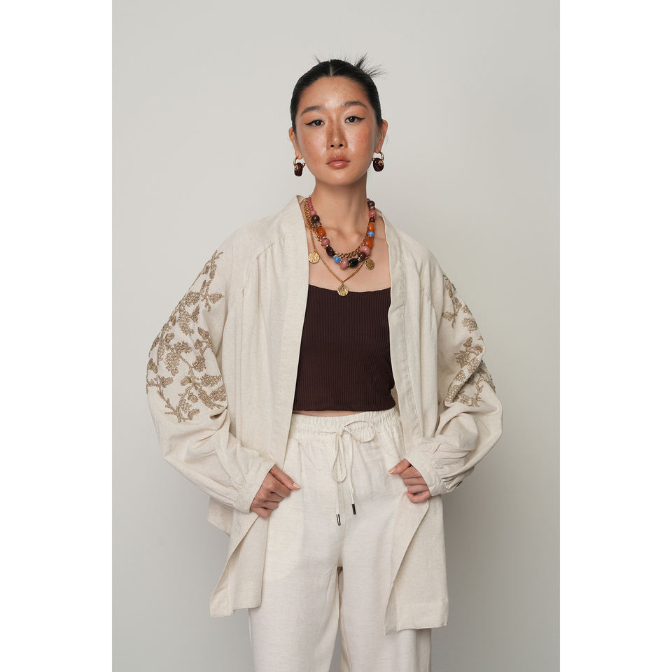 Pantaloni da donna a gamba dritta, vestibilità ampia, colore naturale, con elastico in vita