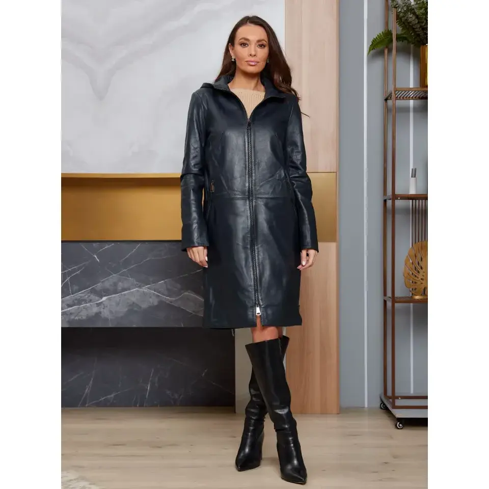 Cappotto in Pelle con Cappuccio Blu Navy per Donne – Vestibilità Lunga, Chiusura a Zip Elegante, Finitura in Pelle di Agnello