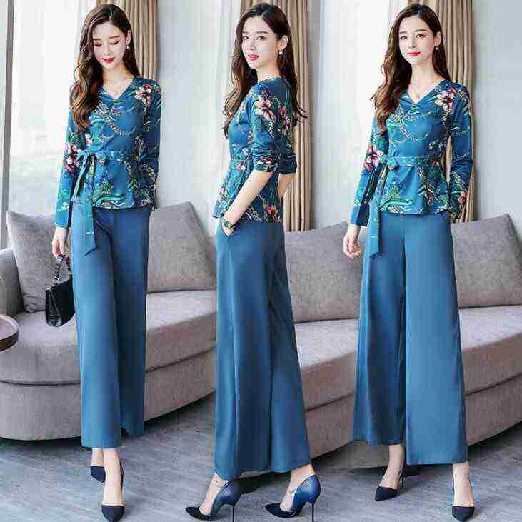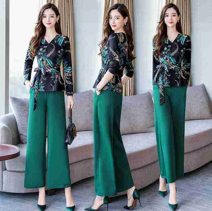 Women's New Autumn Printing Casual Two-Piece Suit Female Wide Leg Pants & Breathable Chiffon Skirt for Summer Flat Front Style