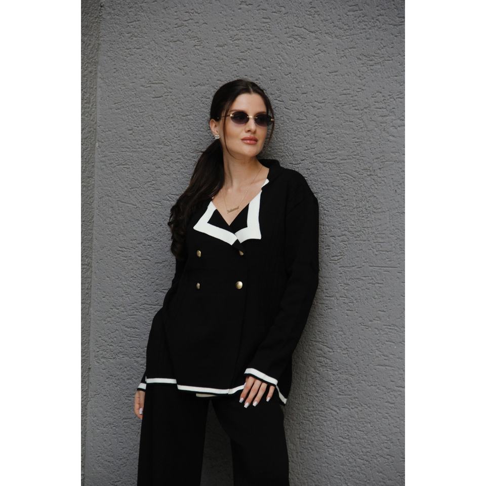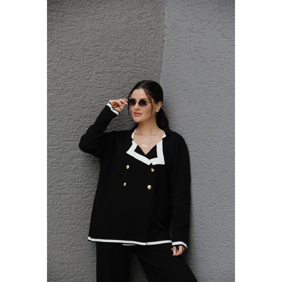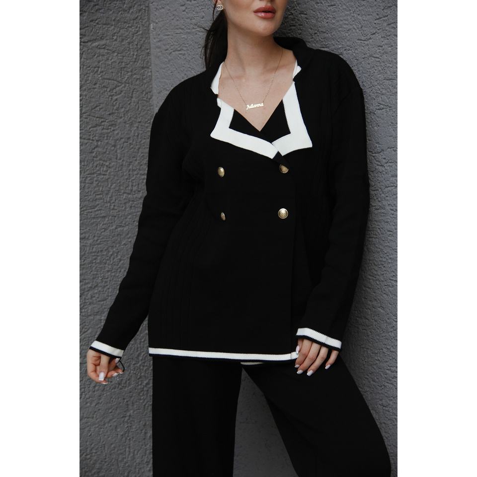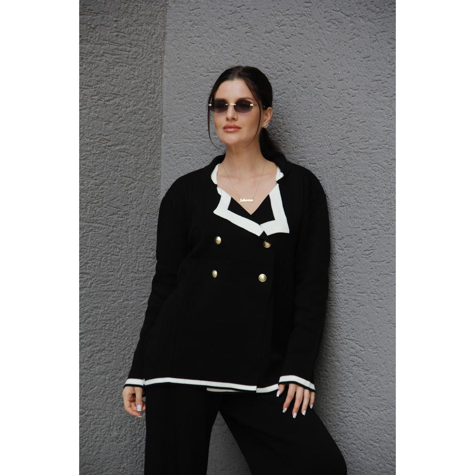 Women's Oversize Black Acrylic Knitwear Suit Standard Size Gold Four-Button Double-Breasted Cardigan Trousers