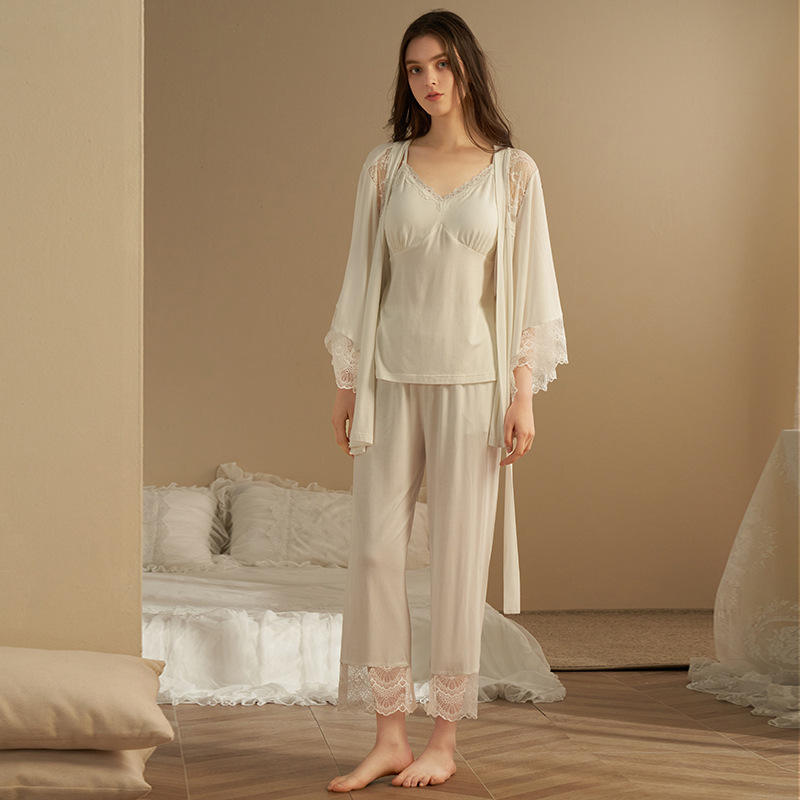Pigiama da Donna Primavera Estate in Modal, Vestaglia con Spalline, Set 3 Pezzi Sexy in Pizzo, Abbigliamento da Casa con Imbottitura al Seno, Vita Elastica, Logo Personalizzabile