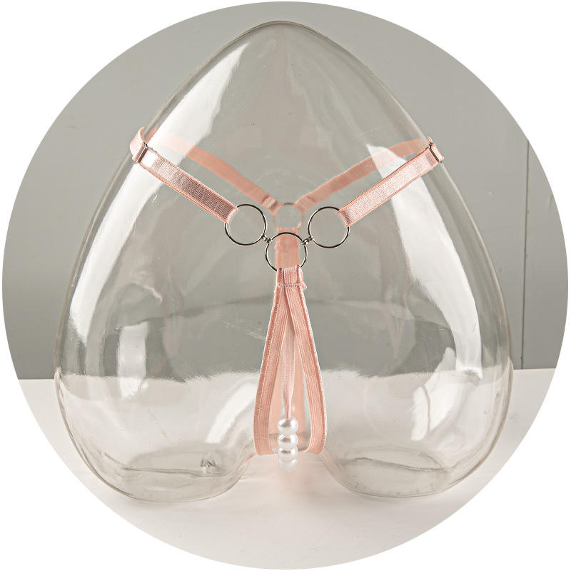 Women's Pearl Decorated Open Crotch G String Thong With Satin Straps Adjustable Rings Sexy Lingerie