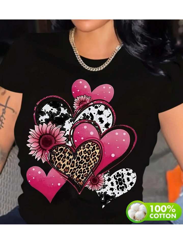 Women's Pink Heart Leopard Print T-Shirt Short Sleeve Round Neck Casual Comfort Fit Valentine's Day Top Cotton Jersey Printed