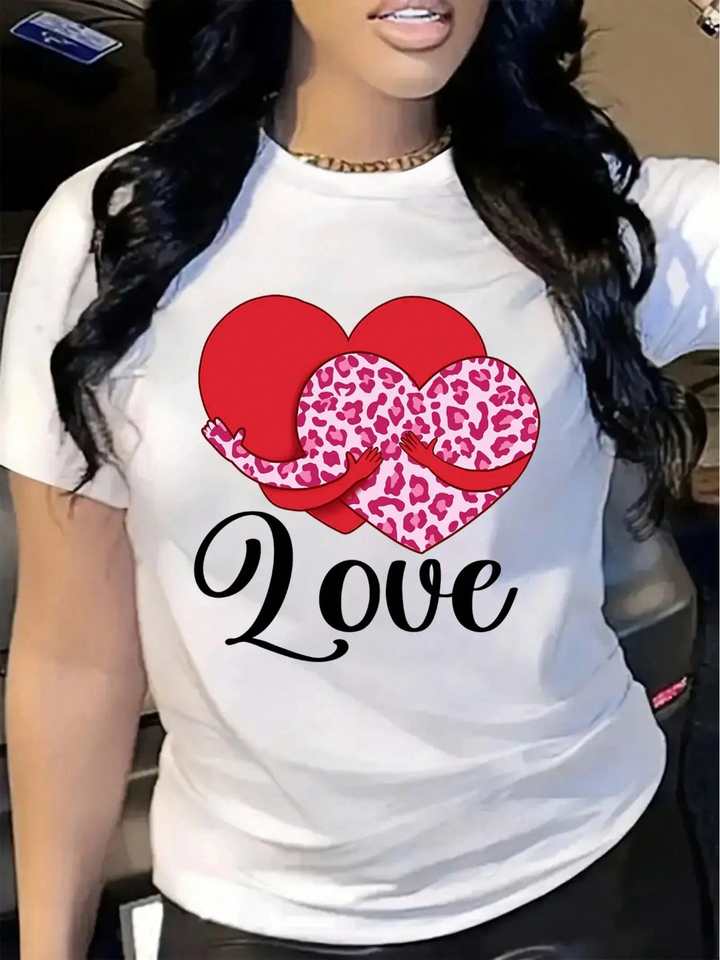 Women's Pink Leopard Print Heart Love T-Shirt Short Sleeve Round Neck Casual Top For Valentine's Day Gift With Bow Design